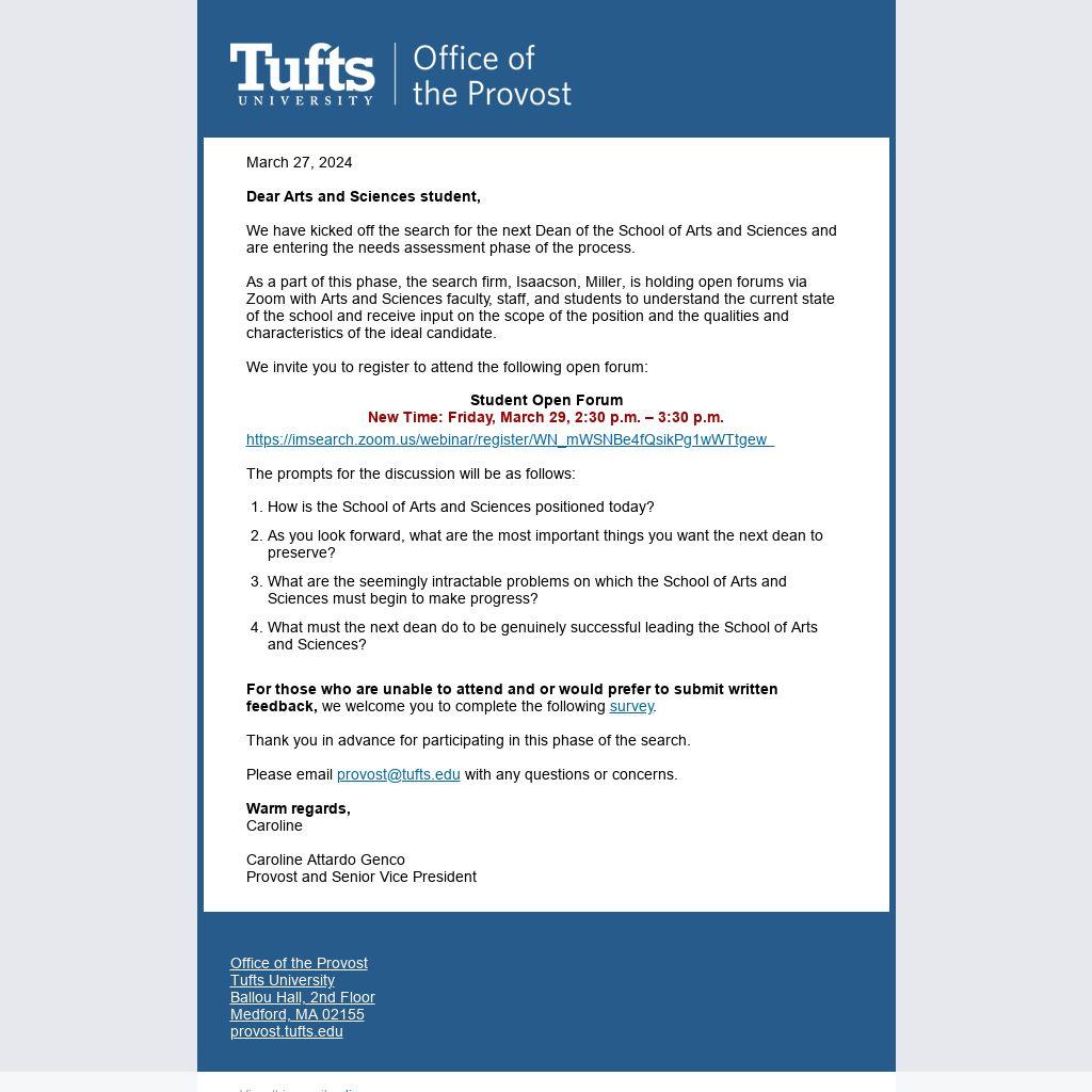 As a part of this phase, the search firm, Isaacson, Miller, is holding open forums via Zoom with Arts and Sciences faculty, staff, and students to understand the current state of the school and receive input on the scope of the position and the qualities and characteristics of the ideal candidate.