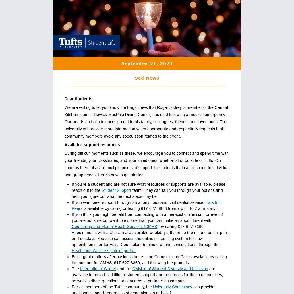 We are writing to let you know the tragic news that Roger Jodrey, a member of the Central Kitchen team in Dewick-MacPhie Dining Center, has died following a medical emergency. Our hearts and condolences go out to his family, colleagues, friends, and loved ones. The university will provide more information when appropriate and respectfully requests that community members avoid any speculation related to the event.