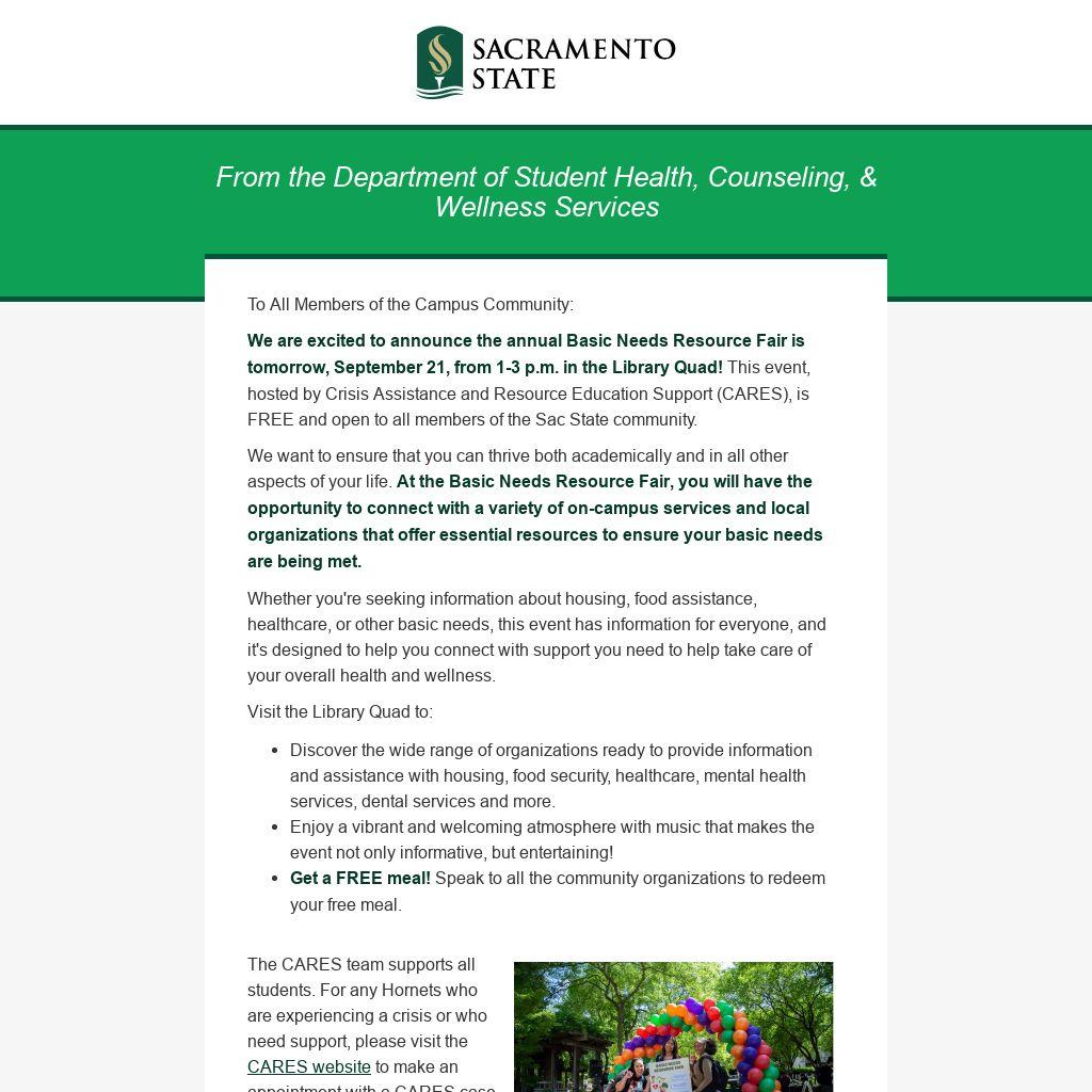 We are excited to announce the annual Basic Needs Resource Fair is tomorrow, September 21, from 1-3 p.m. in the Library Quad! This event, hosted by Crisis Assistance and Resource Education Support (CARES), is FREE and open to all members of the Sac State community.