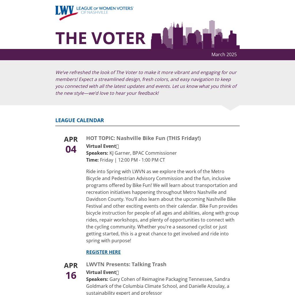 As we move into spring, the League of Women Voters of Nashville is focused and motivated by the work ahead and proud of the meaningful progress we’ve made so far this year. We want to thank each and every one of our members for your incredible dedication, passion, and commitment to strengthening democracy in our community. Your efforts are felt throughout Nashville—from voter education and public health advocacy to sustainability initiatives and beyond.