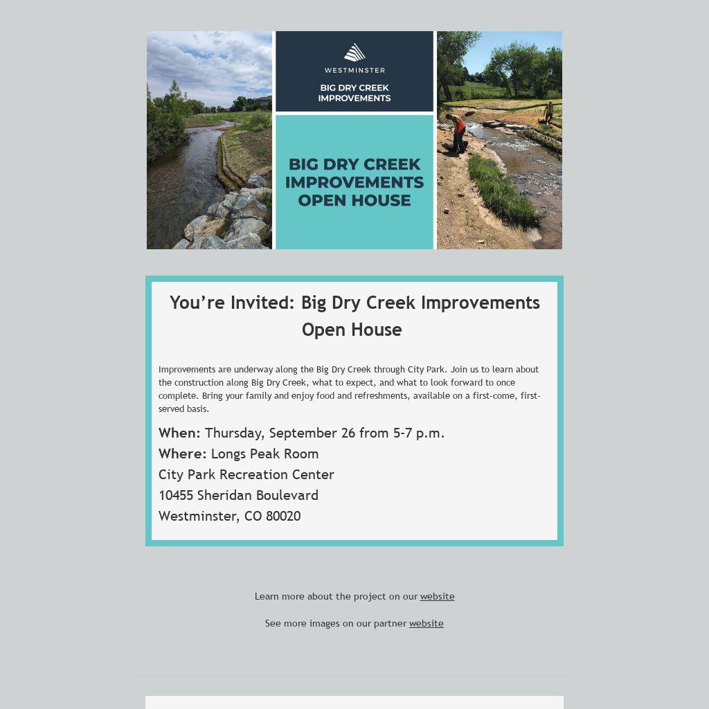 Improvements are underway along the Big Dry Creek through City Park. Join us to learn about the construction along Big Dry Creek, what to expect, and what to look forward to once complete. Bring your family and enjoy food and refreshments, available on a first-come, first-served basis.