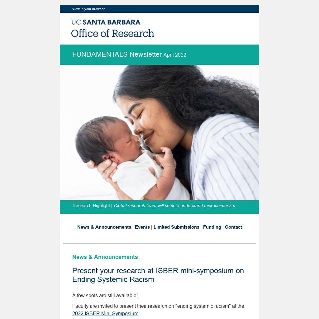 The Research Development unit of the Office of Research at the UC Santa Barbara publishes the Fundamentals Newsletter. Click here to get in touch with Research Development staff regarding your proposal development needs.