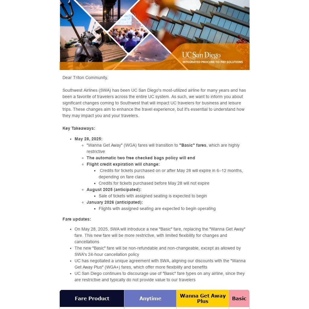 Southwest Airlines (SWA) has been UC San Diego's most-utilized airline for many years and has been a favorite of travelers across the entire UC system. As such, we want to inform you about significant changes coming to Southwest that will impact UC travelers for business and leisure trips. These changes aim to enhance the travel experience, but it's essential to understand how they may impact you and your travelers.