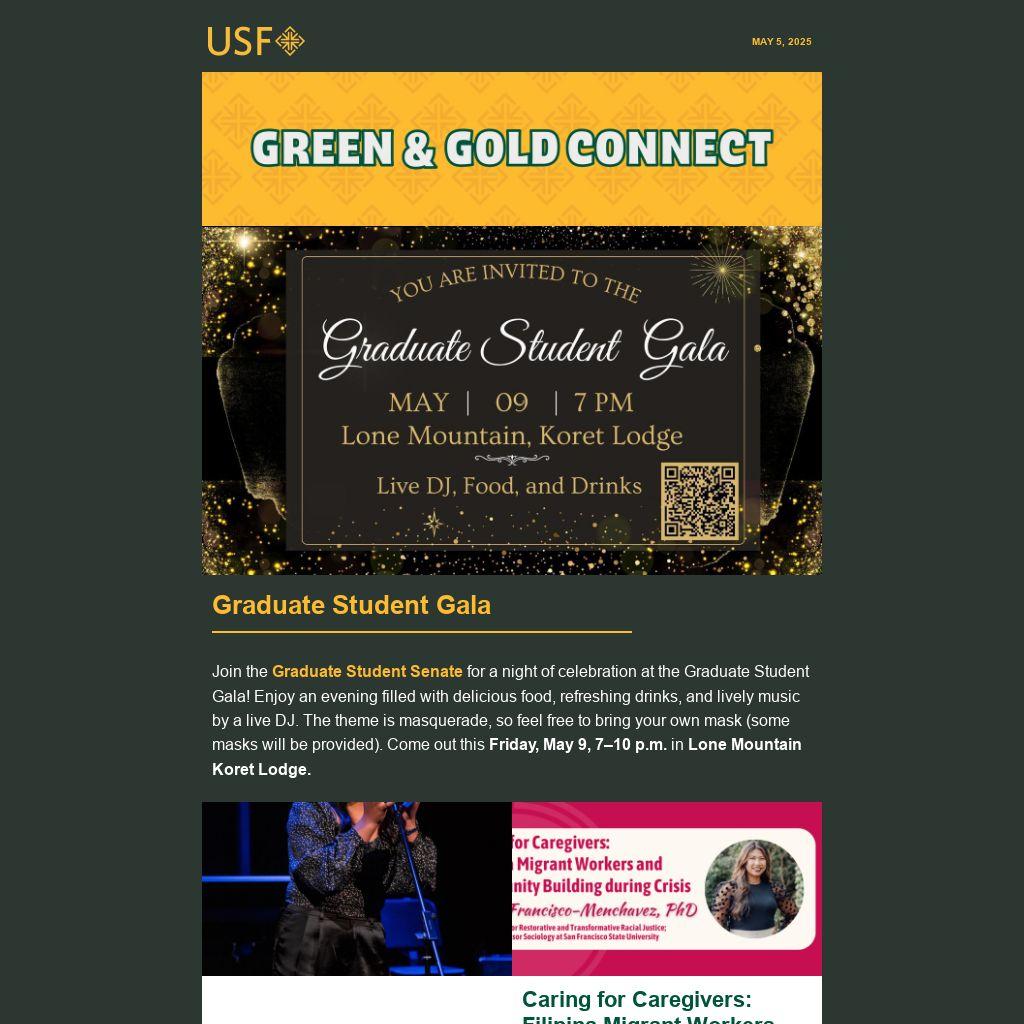 Join the Graduate Student Senate for a night of celebration at the Graduate Student Gala! Enjoy an evening filled with delicious food, refreshing drinks, and lively music by a live DJ. The theme is masquerade, so feel free to bring your own mask (some masks will be provided). Come out this Friday, May 9, 7–10 p.m. in Lone Mountain Koret Lodge.