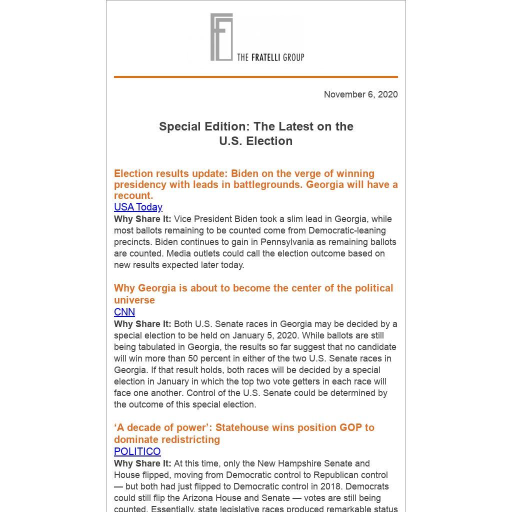 Why Share It: Vice President Biden took a slim lead in Georgia, while most ballots remaining to be counted come from Democratic-leaning precincts. Biden continues to gain in Pennsylvania as remaining ballots are counted. Media outlets could call the election outcome based on new results expected later today.