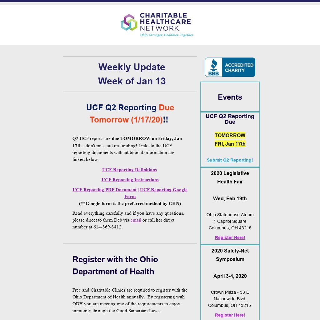 The start of the new year means a fresh calendar full of events and neat ways for you to get involved! The Charitable Healthcare Network will be holding our annual Legislative Health Fair at the Ohio Statehouse Atrium on Wednesday, February 19th. CHN members are encouraged to set up a table at the Atrium and provide simple health screenings to Legislators and their staff while discussing with about the work charitable health care organizations are doing in their districts and across Ohio. Make your voice heard and join us for this unique legislative advocacy event! Please direct questions to Katie via email or at 614-869-3413.