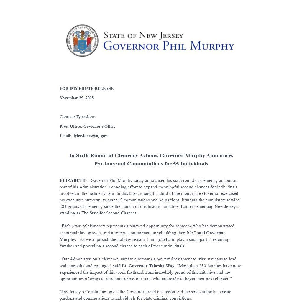 “As families across New Jersey prepare to gather in gratitude this Thanksgiving, Governor Murphy has offered many more individuals something truly life-changing to be thankful for: the chance to begin again. By granting over 50 additional pardons and commutations, the Governor reminds us that mercy is not seasonal — it is a year-round commitment to recognizing human dignity and the possibility of renewal,” said Bishop Joshua Rodriguez, Chair of the New Jersey Clemency Advisory Board. “This holiday invites us to reflect on grace, generosity, and the bonds that hold our communities together.