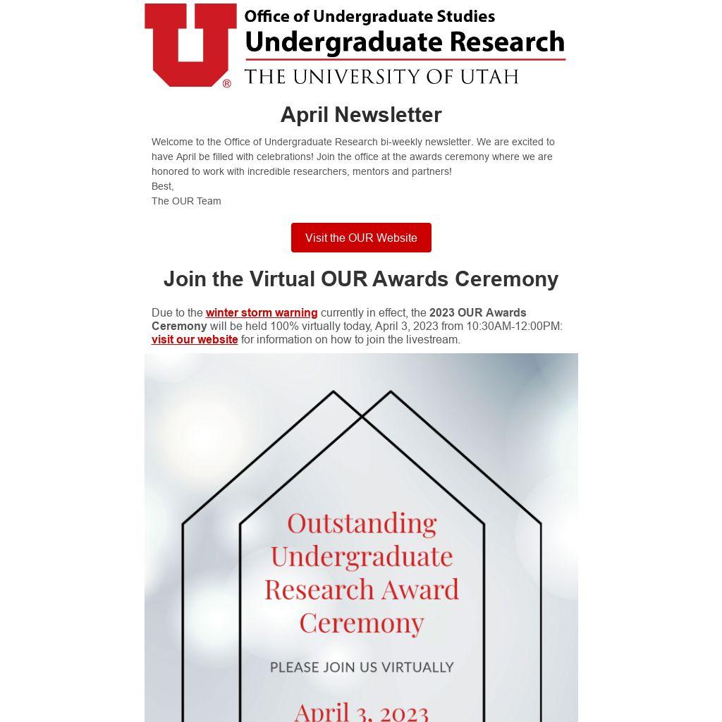 Welcome to the Office of Undergraduate Research bi-weekly newsletter. We are excited to have April be filled with celebrations! Join the office at the awards ceremony where we are honored to work with incredible researchers, mentors and partners!