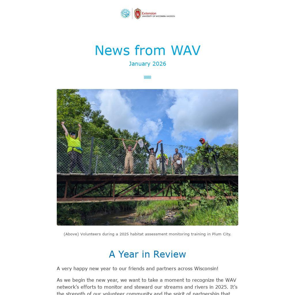 As we begin the new year, we want to take a moment to recognize the WAV network’s efforts to monitor and steward our streams and rivers in 2025. It’s the strength of our volunteer community and the spirit of partnership that makes our volunteer monitoring program impactful in Wisconsin.