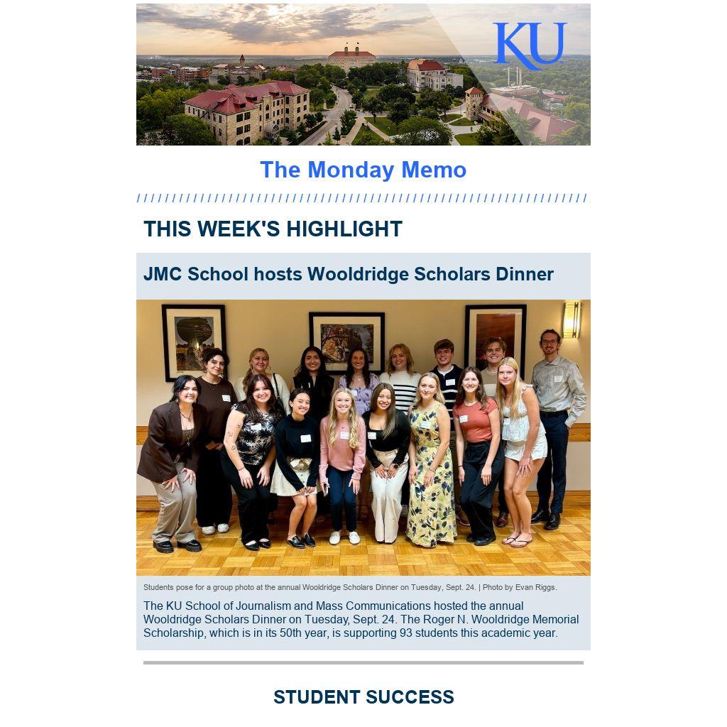 The KU School of Journalism and Mass Communications hosted the annual Wooldridge Scholars Dinner on Tuesday, Sept. 24. The Roger N. Wooldridge Memorial Scholarship, which is in its 50th year, is supporting 93 students this academic year.