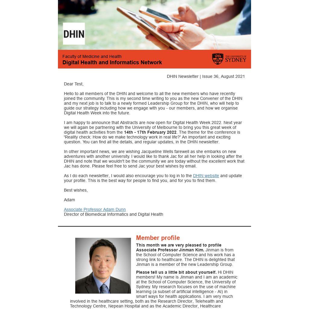 Please tell us a little bit about yourself. Hi DHIN members! My name is Jinman and I am an academic at the School of Computer Science, the University of Sydney. My research focuses on the use of machine learning (a subset of artificial intelligence - AI) in smart ways for health applications. I am very much involved in the healthcare setting, both as the Research Director, Telehealth and Technology Centre, Nepean Hospital and as the Academic Director, Healthcare Engineering (Westmead Academic Initiative). Continue reading