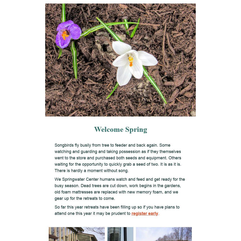 We Springwater Center humans watch and feed and get ready for the busy season. Dead trees are cut down, work begins in the gardens, old foam mattresses are replaced with new memory foam, and we gear up for the retreats to come.