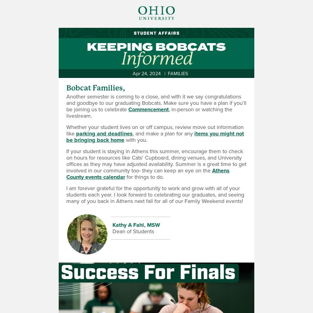 If your student is staying in Athens this summer, encourage them to check on hours for resources like Cats' Cupboard, dining venues, and University offices as they may have adjusted availability. Summer is a great time to get involved in our community too- they can keep an eye on the Athens County events calendar for things to do.