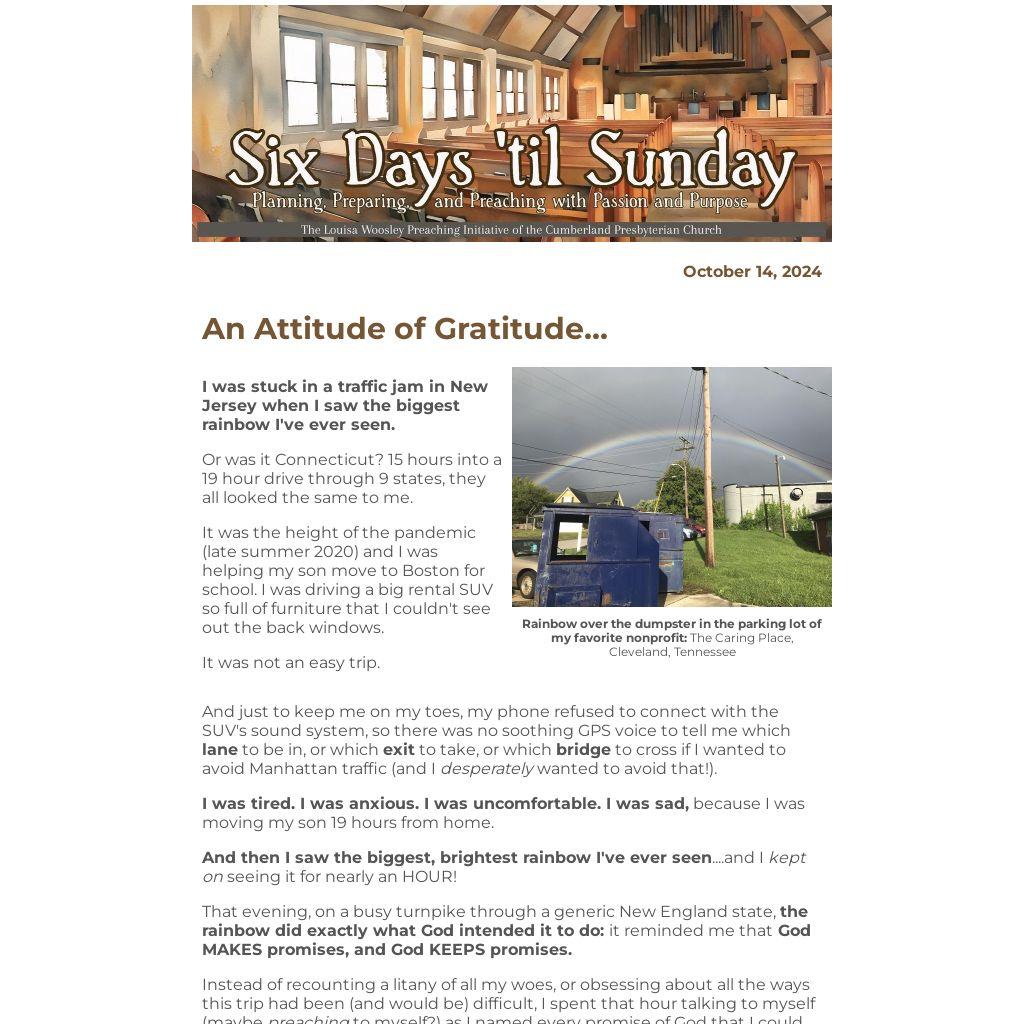 As you prepare this Sunday's sermon, I pray that you'll find something to be grateful for each step of the way...and that your sermon will help people pay attention to God in ways that make them grateful, too.