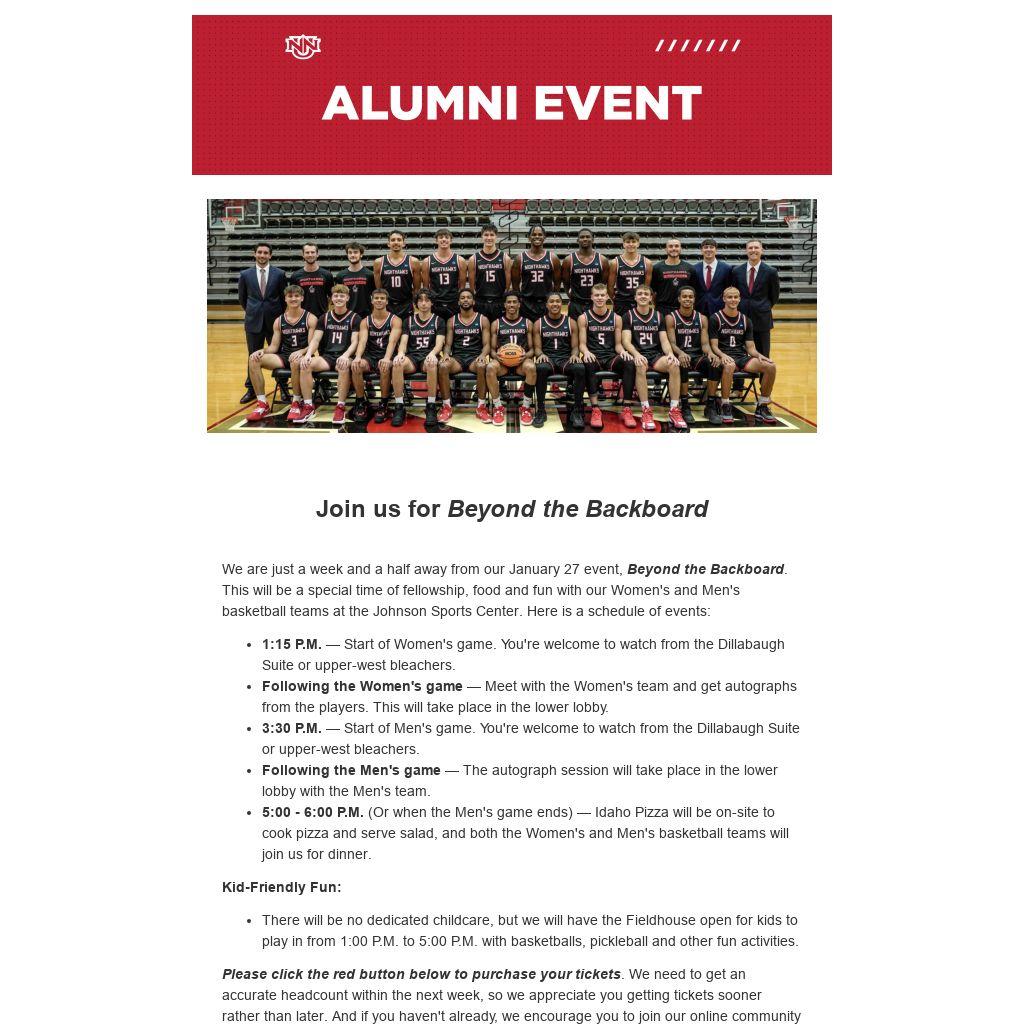 We are just a week and a half away from our January 27 event, Beyond the Backboard. This will be a special time of fellowship, food and fun with our Women's and Men's basketball teams at the Johnson Sports Center. Here is a schedule of events: