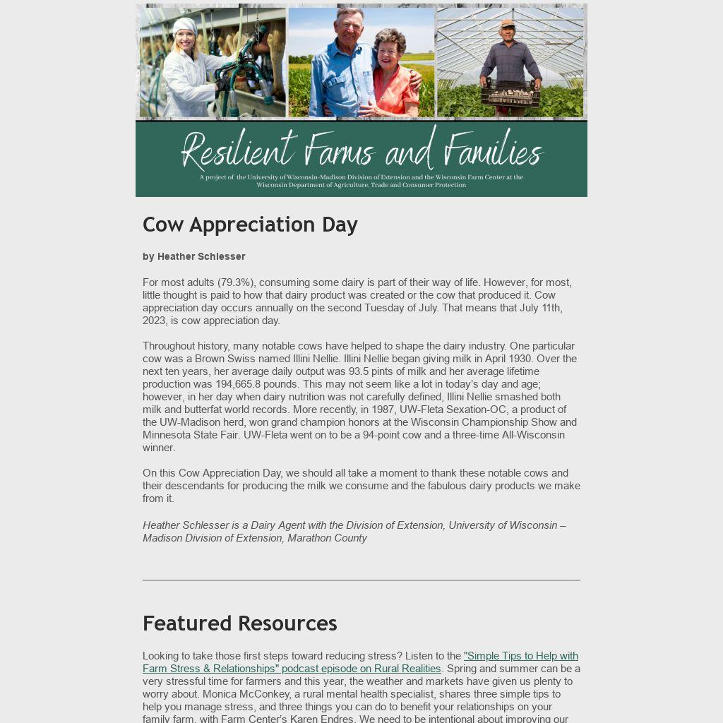 You are invited to join the Resilient Farms & Families Advisory board meeting on July 18th in Spring Green. This meeting will bring together academic, industry, farming, and healthcare professionals to review the work done to address farmer stress over the past year and set priorities for next year. If you attend, you can share your efforts to address farmer stress in Wisconsin. The board meeting is free; RSVPs are required. Lunch will be provided.