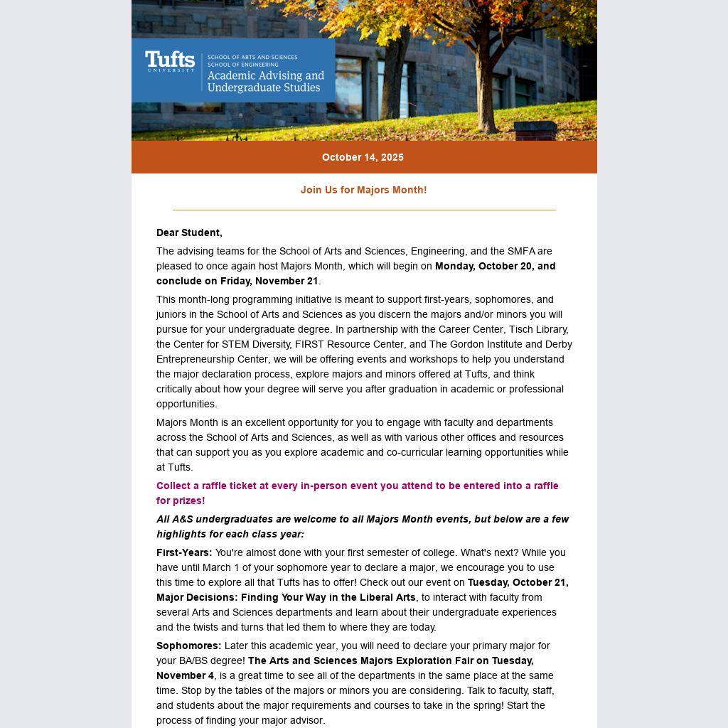 Majors Month is an excellent opportunity for you to engage with faculty and departments across the School of Arts and Sciences, as well as with various other offices and resources that can support you as you explore academic and co-curricular learning opportunities while at Tufts.