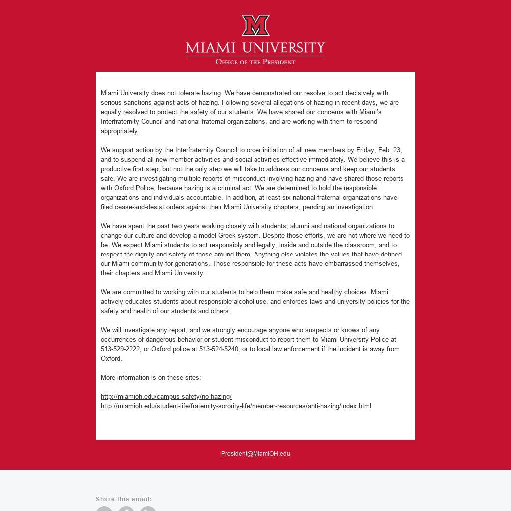 Miami University does not tolerate hazing. We have demonstrated our resolve to act decisively with serious sanctions against acts of hazing. Following several allegations of hazing in recent days, we are equally resolved to protect the safety of our students. We have shared our concerns with Miami’s Interfraternity Council and national fraternal organizations, and are working with them to respond appropriately.