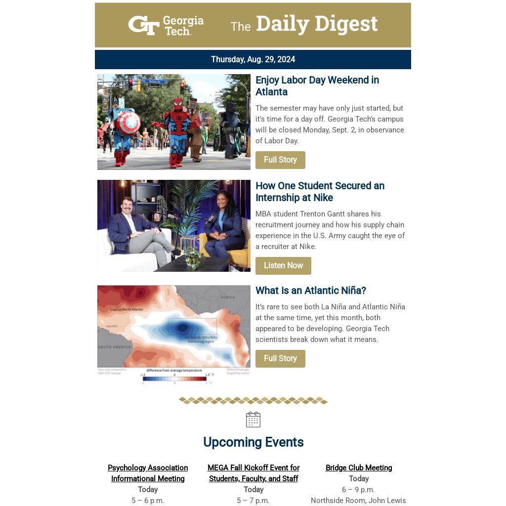 | The semester may have only just started, but it’s time for a day off. Georgia Tech’s campus will be closed Monday, Sept. 2, in observance of Labor Day.