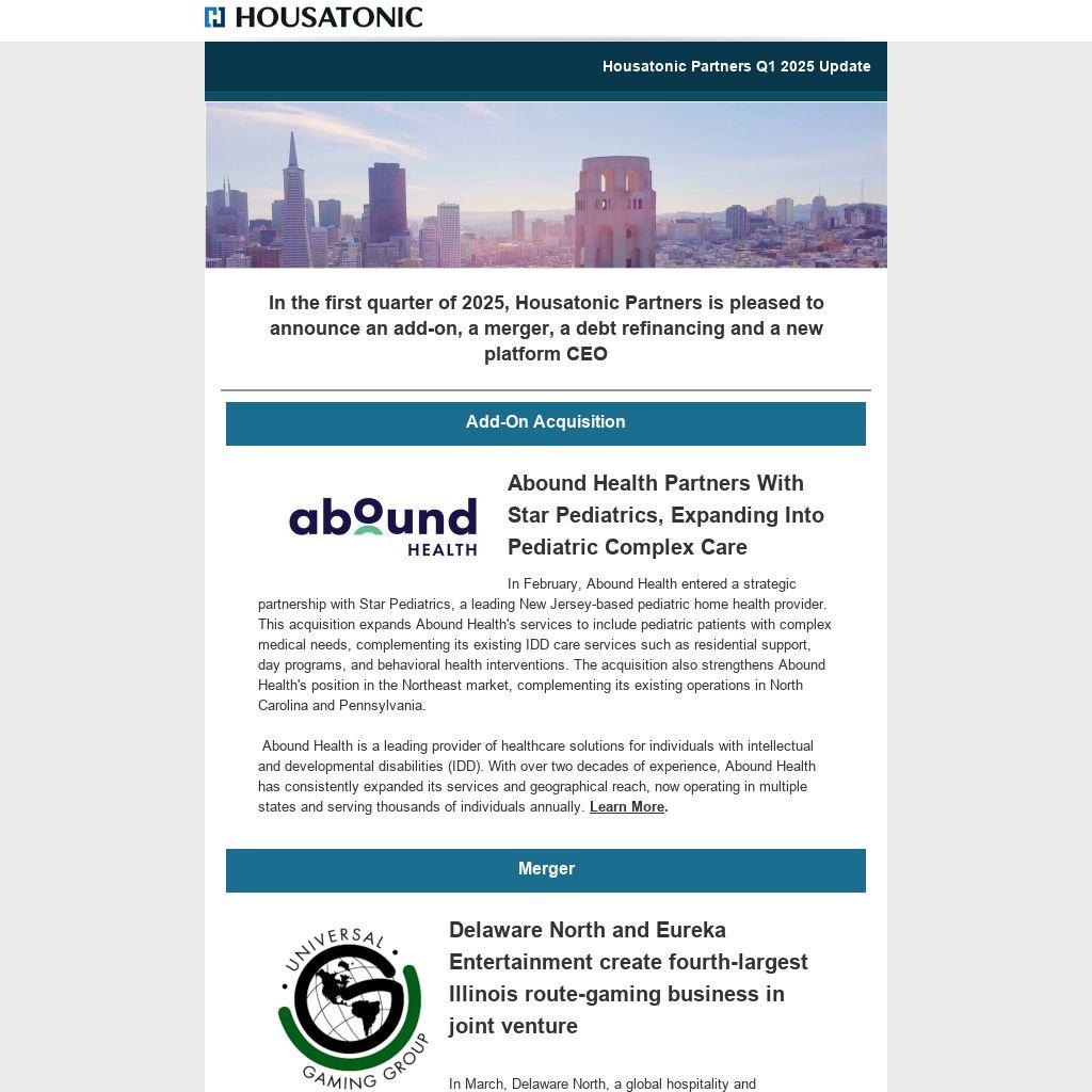 In the first quarter of 2025, Housatonic Partners is pleased to announce an add-on, a merger, a debt refinancing and a new platform CEO