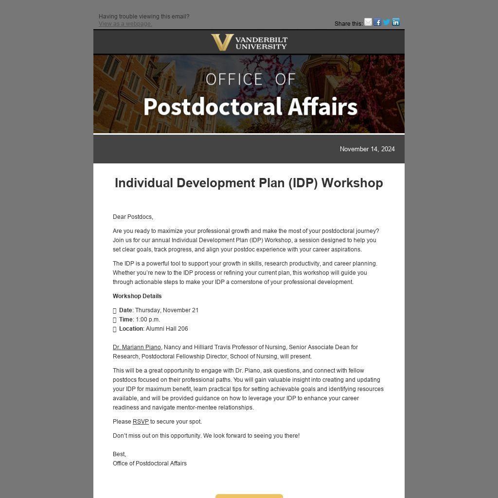 This will be a great opportunity to engage with Dr. Piano, ask questions, and connect with fellow postdocs focused on their professional paths. You will gain valuable insight into creating and updating your IDP for maximum benefit, learn practical tips for setting achievable goals and identifying resources available, and will be provided guidance on how to leverage your IDP to enhance your career readiness and navigate mentor-mentee relationships.