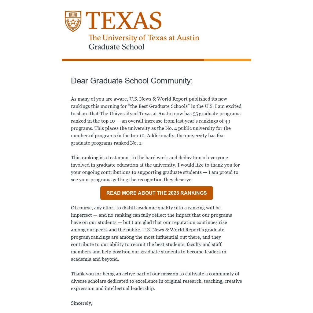 As many of you are aware, U.S. News & World Report published its new rankings this morning for “the Best Graduate Schools” in the U.S. I am excited to share that The University of Texas at Austin now has 55 graduate programs ranked in the top 10 — an overall increase from last year’s rankings of 49 programs. This places the university as the No. 4 public university for the number of programs in the top 10. Additionally, the university has five graduate programs ranked No. 1.