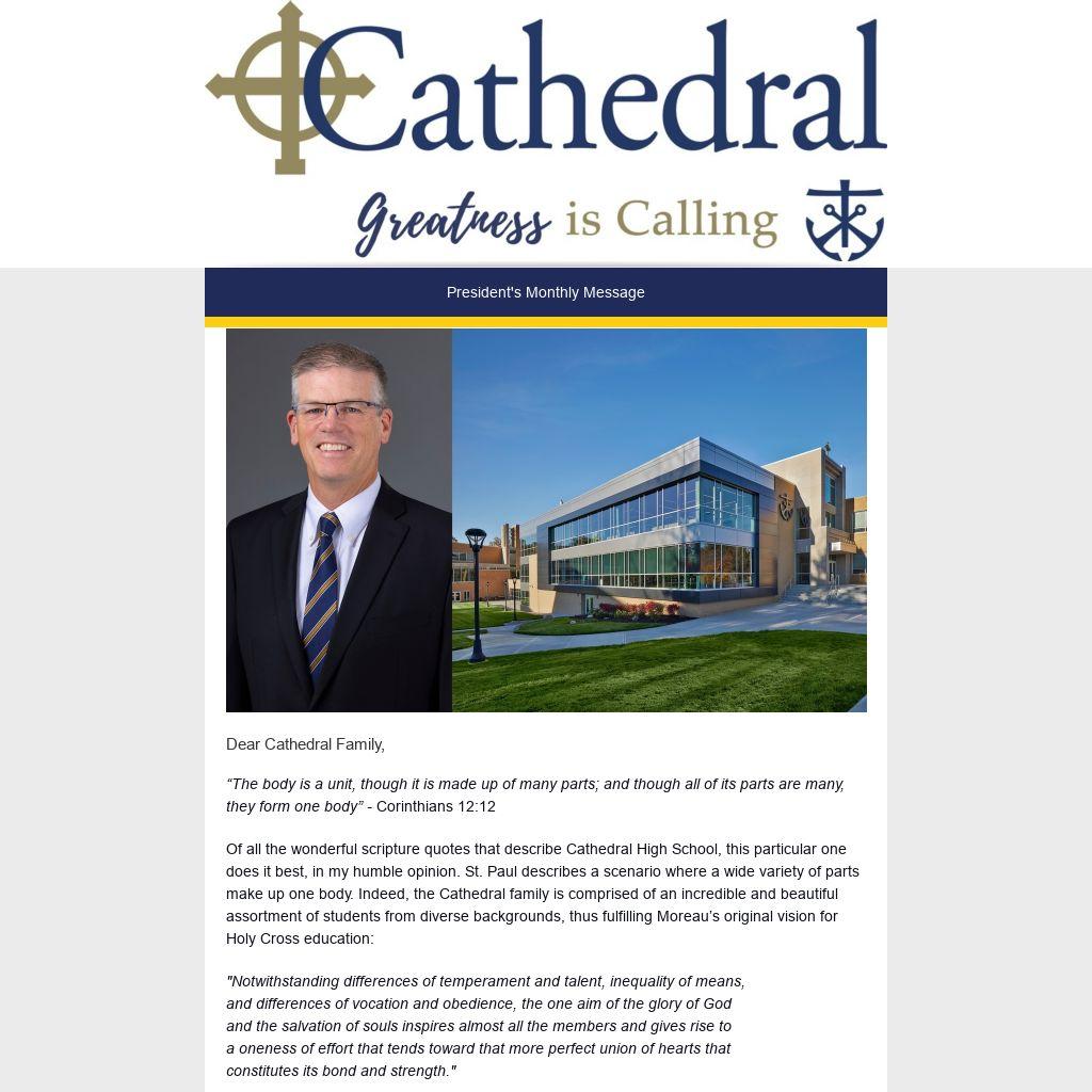 Of all the wonderful scripture quotes that describe Cathedral High School, this particular one does it best, in my humble opinion. St. Paul describes a scenario where a wide variety of parts make up one body. Indeed, the Cathedral family is comprised of an incredible and beautiful assortment of students from diverse backgrounds, thus fulfilling Moreau’s original vision for Holy Cross education:
