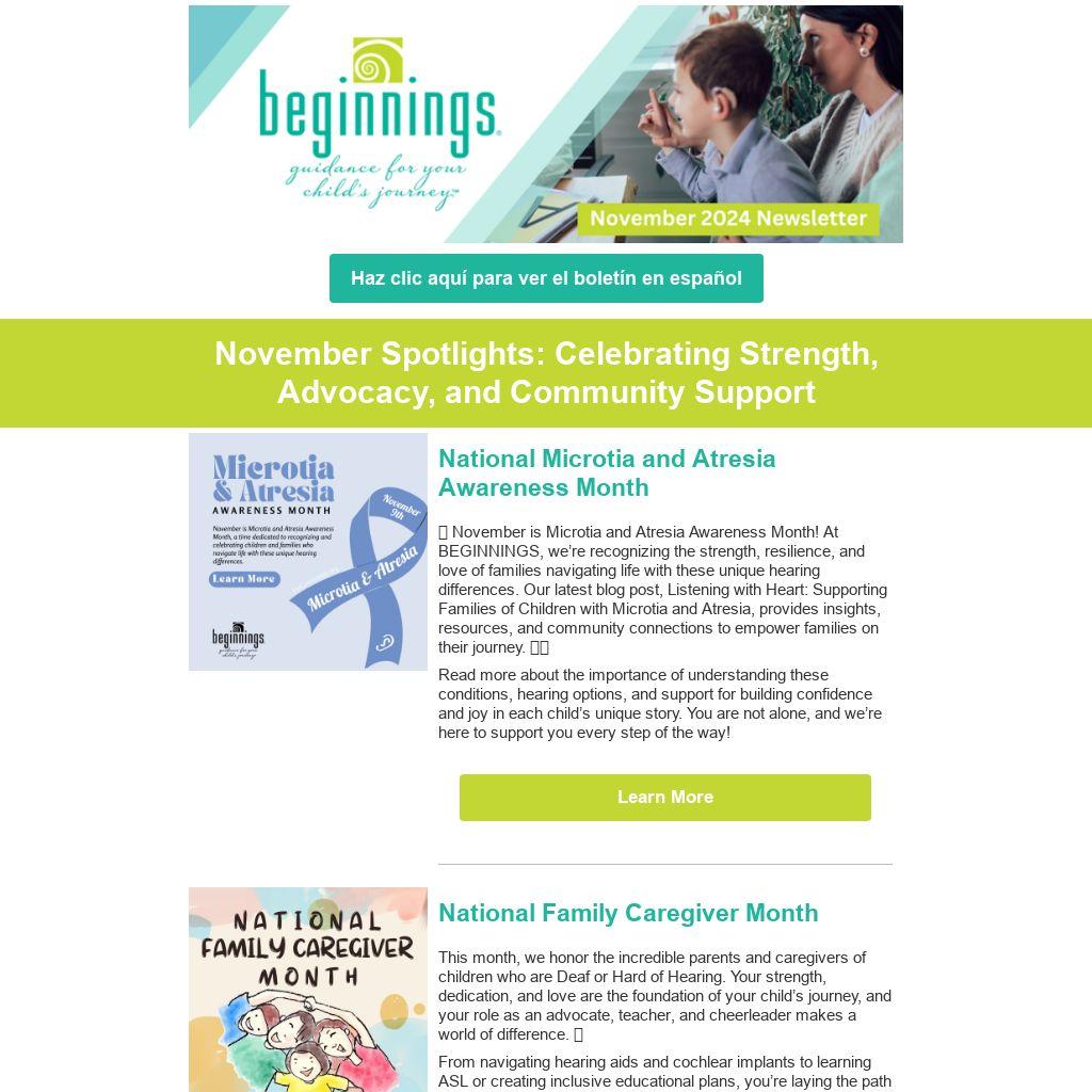 š§” November is Microtia and Atresia Awareness Month! At BEGINNINGS, weāre recognizing the strength, resilience, and love of families navigating life with these unique hearing differences. Our latest blog post, Listening with Heart: Supporting Families of Children with Microtia and Atresia, provides insights, resources, and community connections to empower families on their journey. š¬š