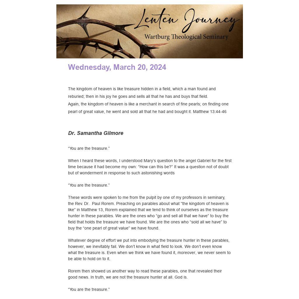 This is one of those sermons that won’t leave me alone. Not because I am so good at accepting my true role in these parables but precisely because I am not. It is usually in the middle of a strenuous treasure hunt when I am anxiously and tearfully knee-deep in the dirt, when I have gone searching for all the wrong reasons, and when I have lost sight of what I am even looking for, that Rorem’s voice resounds in my ears. He tells me that in Christ, God has claimed this field I’ve been mucking around in. He tells me that I’ve been buried in this dirt. But in Christ, by the power of the Holy Spirit, I am being raised up to be treasured forever.
