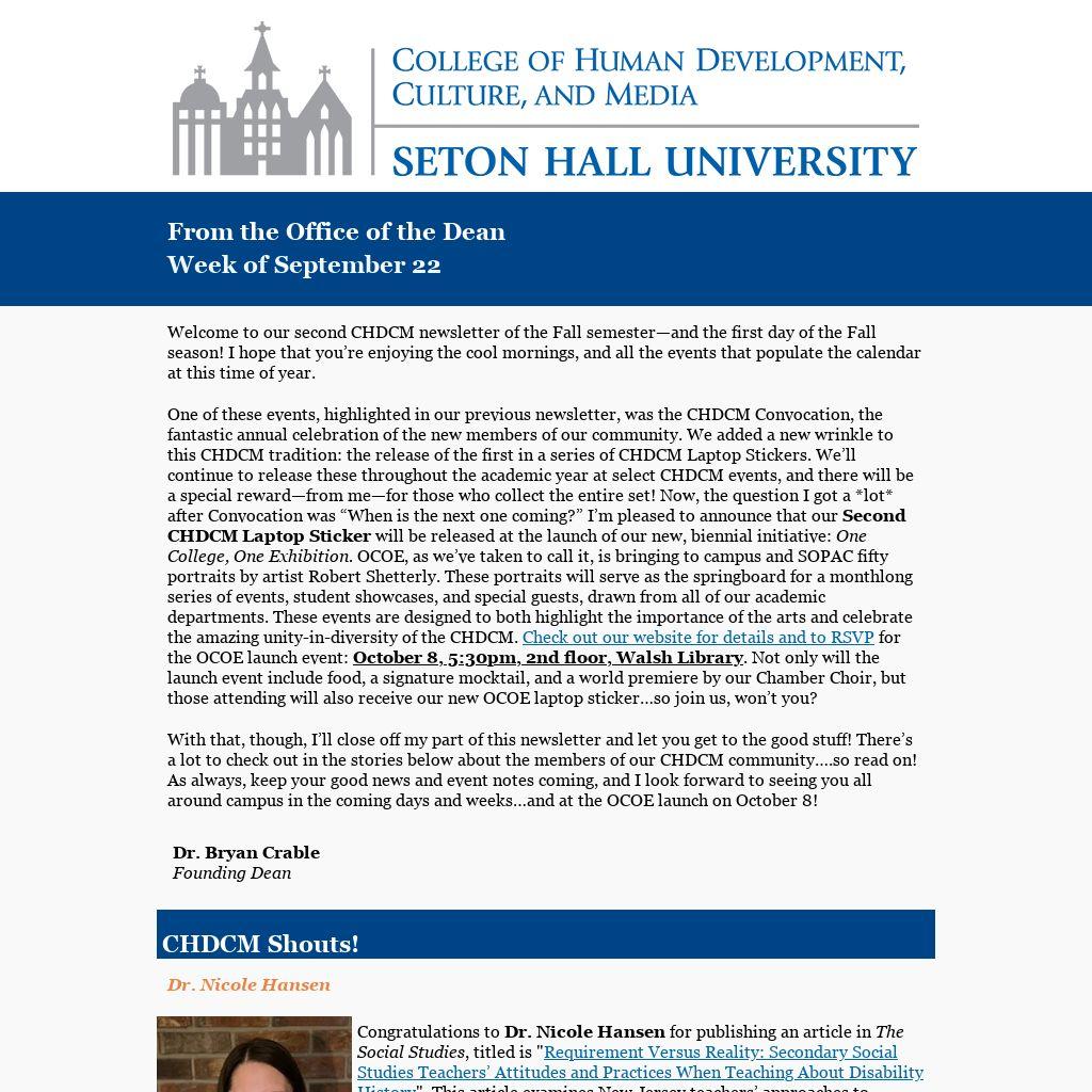 With that, though, I’ll close off my part of this newsletter and let you get to the good stuff! There’s a lot to check out in the stories below about the members of our CHDCM community….so read on! As always, keep your good news and event notes coming, and I look forward to seeing you all around campus in the coming days and weeks…and at the OCOE launch on October 8!