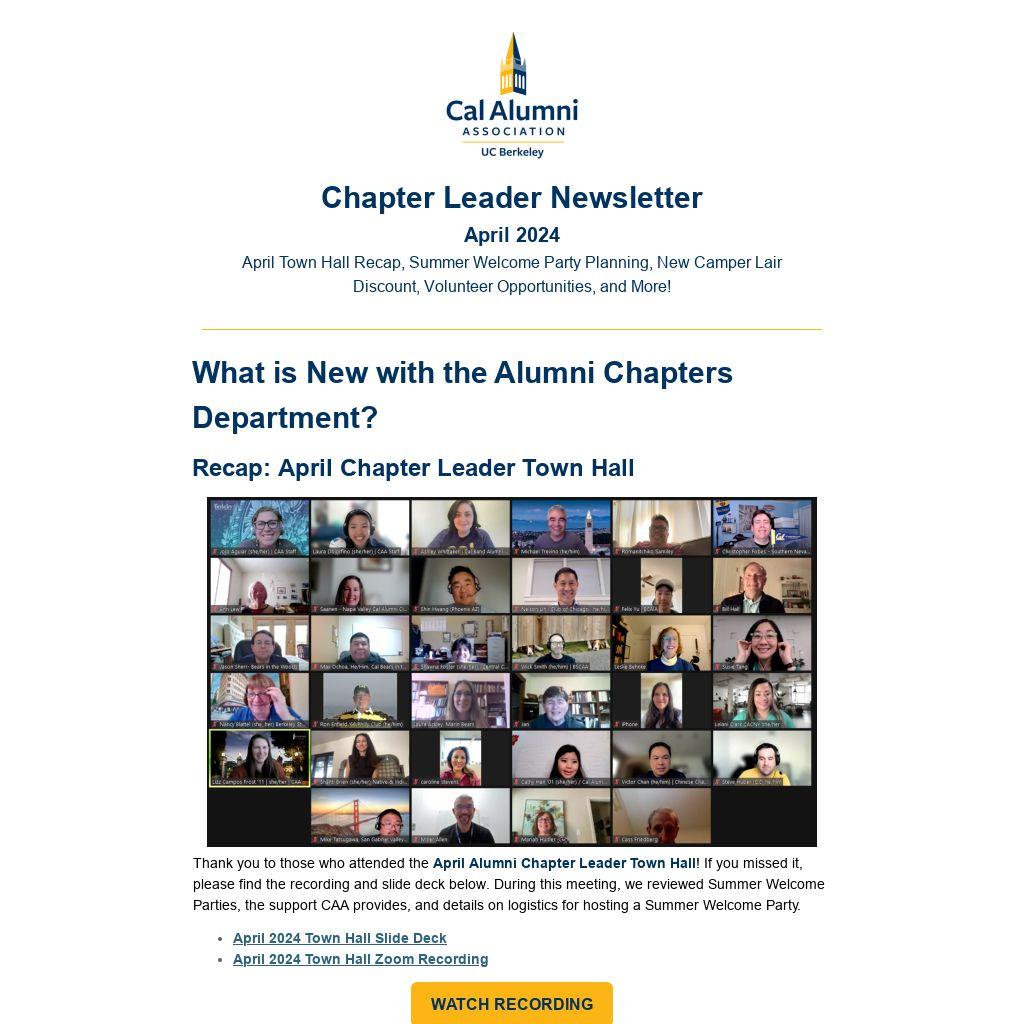 Thank you to those who attended the April Alumni Chapter Leader Town Hall! If you missed it, please find the recording and slide deck below. During this meeting, we reviewed Summer Welcome Parties, the support CAA provides, and details on logistics for hosting a Summer Welcome Party.
