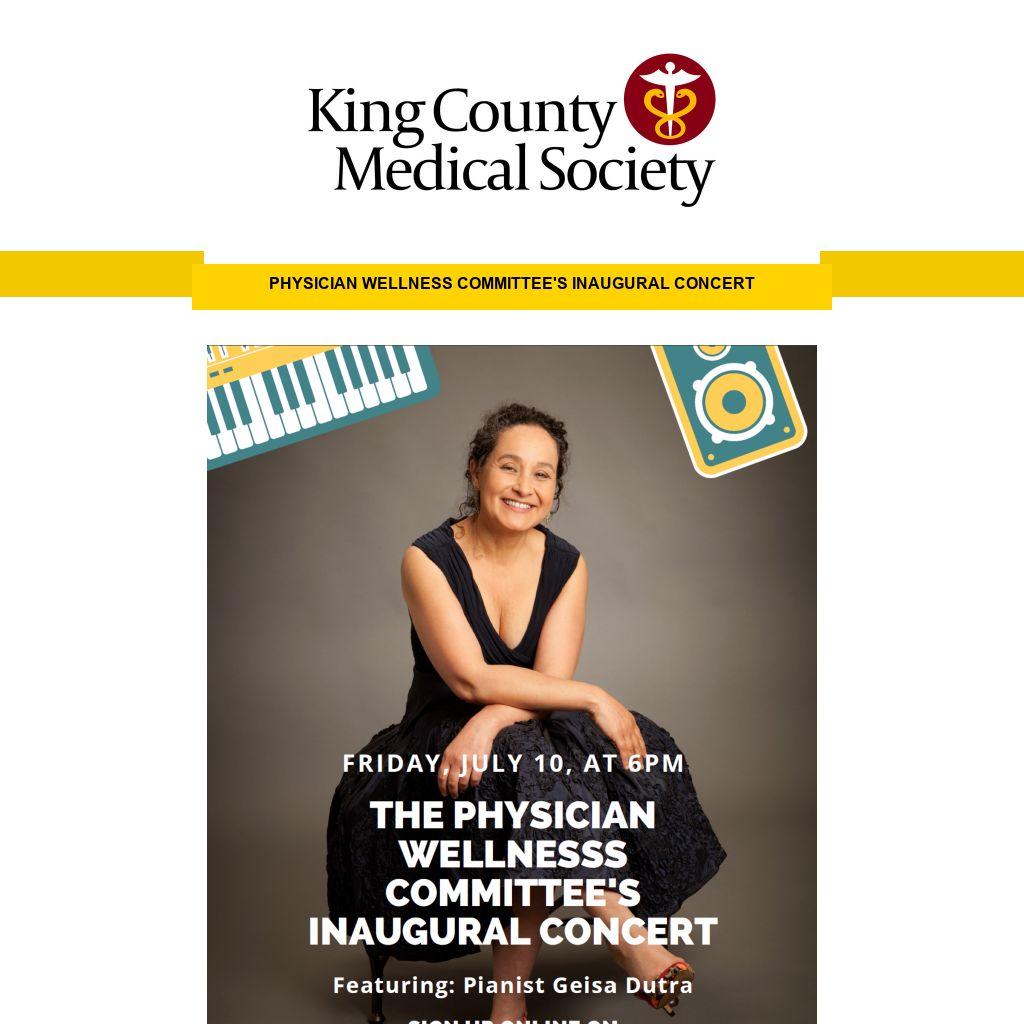 I write to you today to first and foremost invite you to the Physician Wellness Committee's Inaugural Concert, which will be a virtual concert on Friday, July 10, at 6pm PST (music starts at 6:30 pm). The concert is open to everyone, with an optional intro and mingling session before and after for those interested in the committee. Sign up for the concert here.