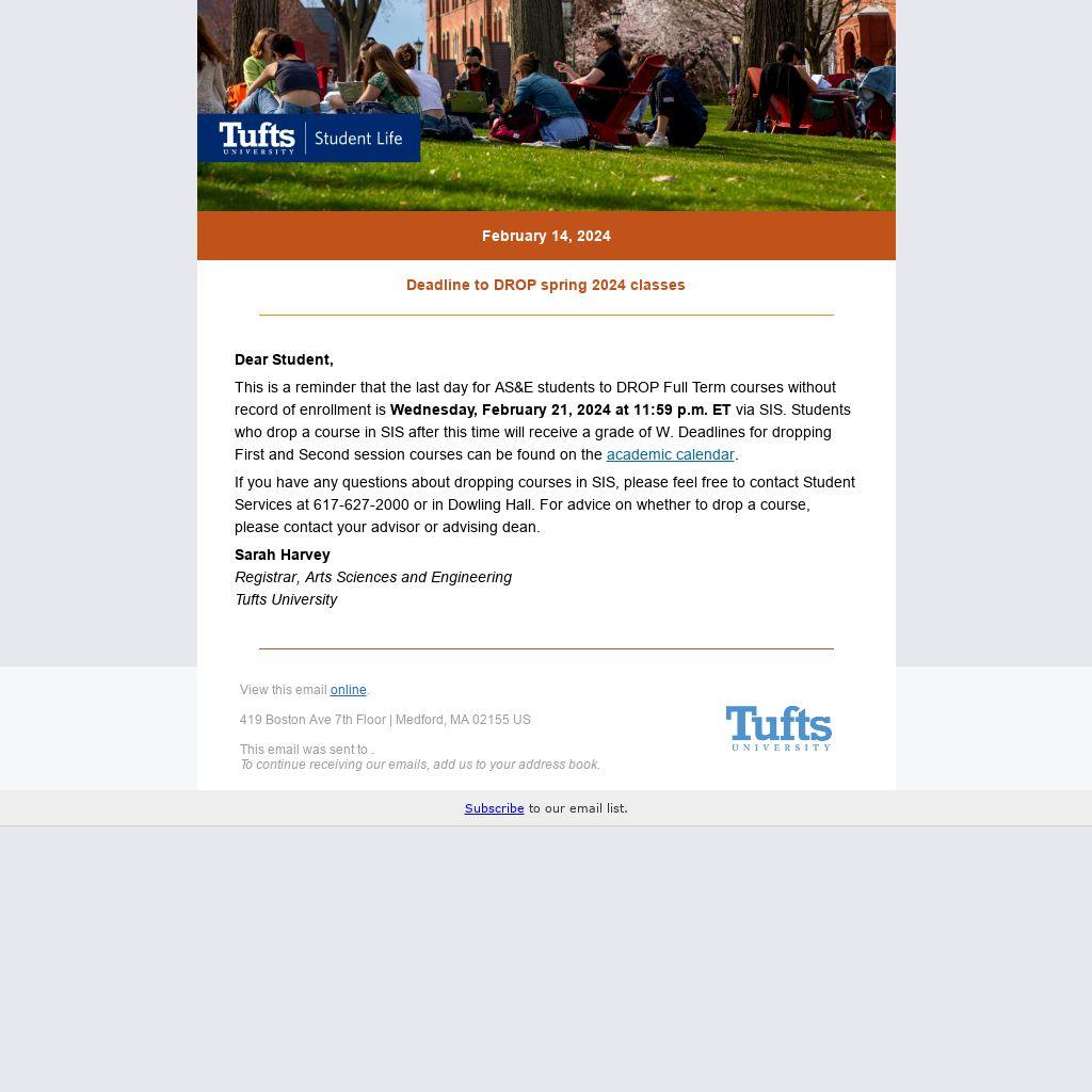 This is a reminder that the last day for AS&E students to DROP Full Term courses without record of enrollment is