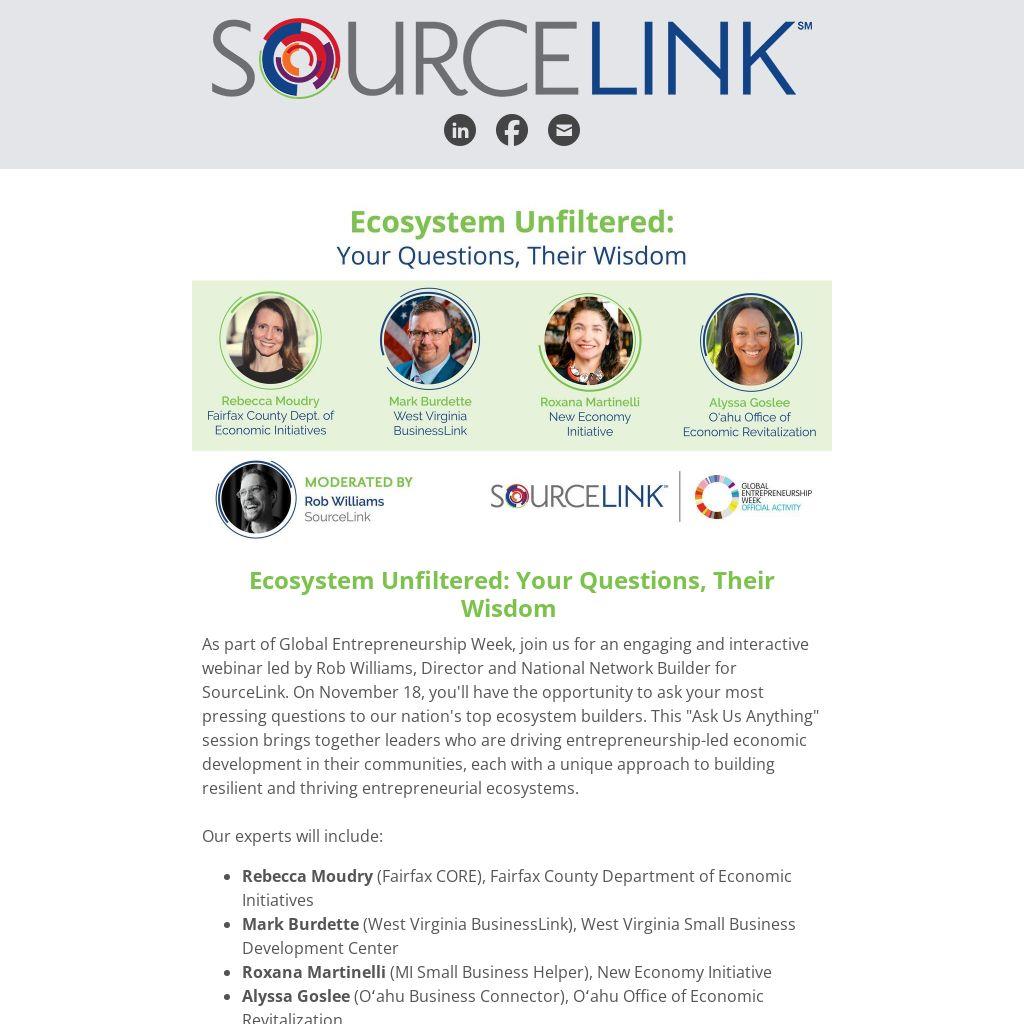 As part of Global Entrepreneurship Week, join us for an engaging and interactive webinar led by Rob Williams, Director and National Network Builder for SourceLink. On November 18, you'll have the opportunity to ask your most pressing questions to our nation's top ecosystem builders. This "Ask Us Anything" session brings together leaders who are driving entrepreneurship-led economic development in their communities, each with a unique approach to building resilient and thriving entrepreneurial ecosystems.