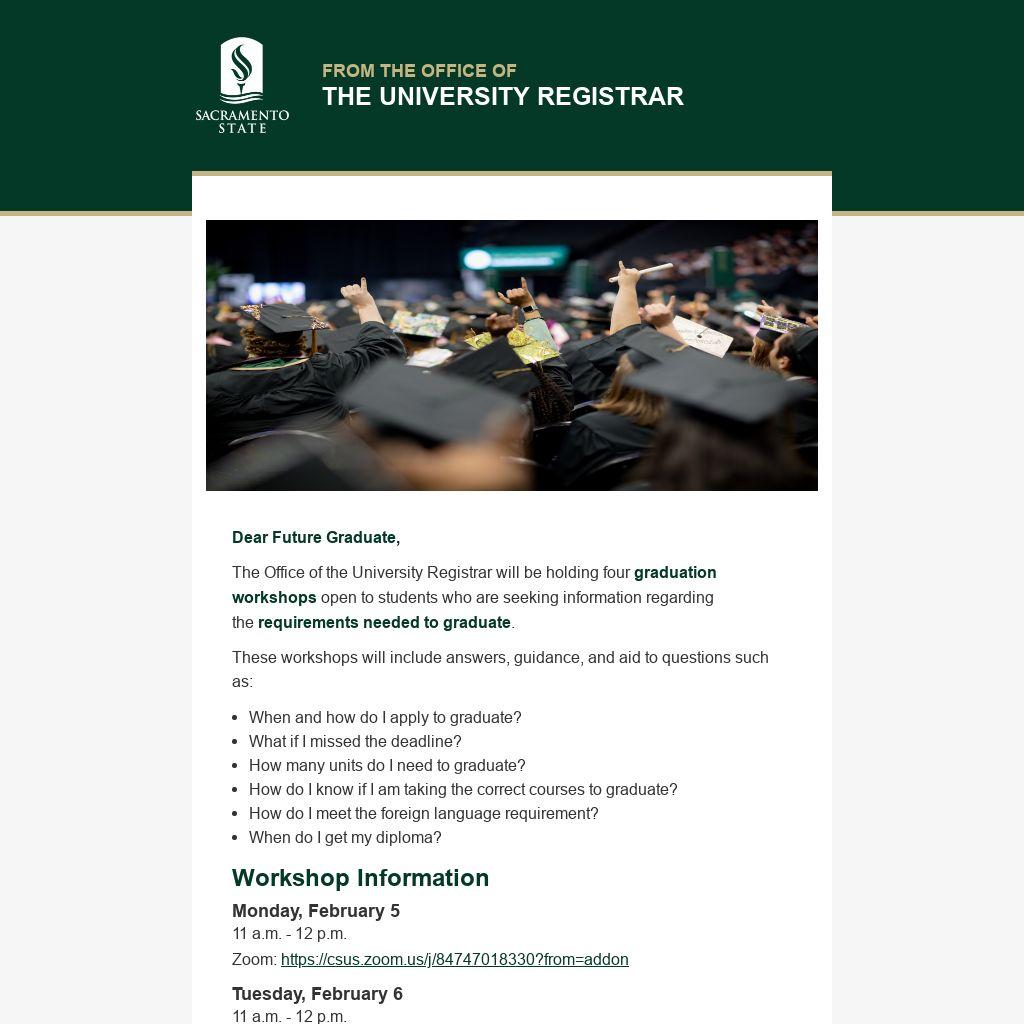 The Office of the University Registrar will be holding four graduation workshops open to students who are seeking information regarding the requirements needed to graduate.