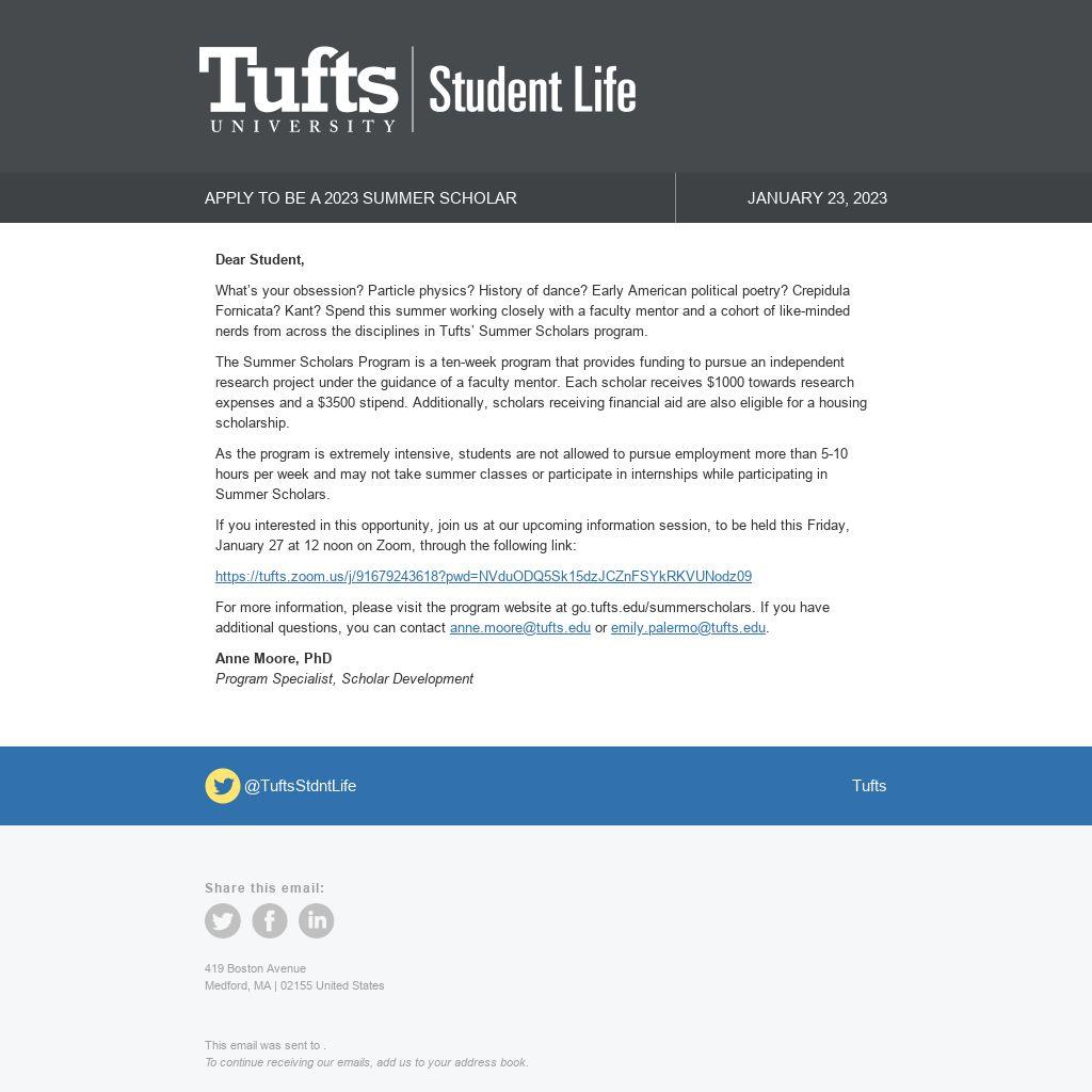 What’s your obsession? Particle physics? History of dance? Early American political poetry? Crepidula Fornicata? Kant? Spend this summer working closely with a faculty mentor and a cohort of like-minded nerds from across the disciplines in Tufts’ Summer Scholars program.