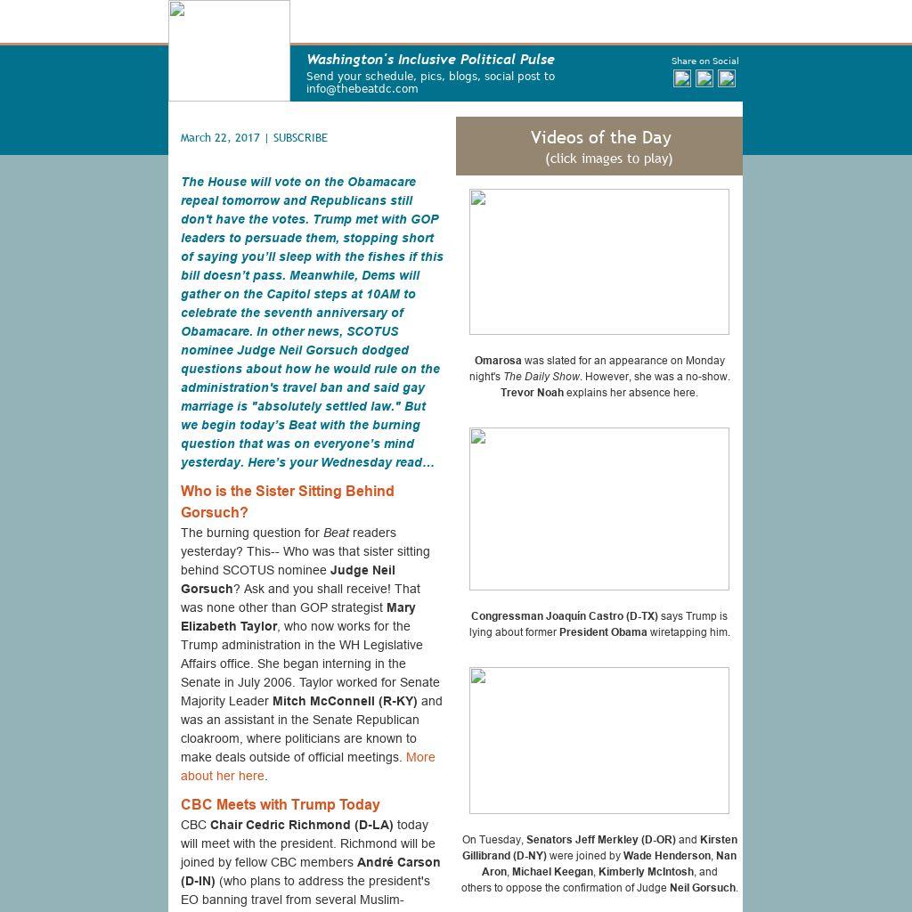 The burning question for Beat readers yesterday? This-- Who was that sister sitting behind SCOTUS nominee Judge Neil Gorsuch? Ask and you shall receive! That was none other than GOP strategist Mary Elizabeth Taylor, who now works for the Trump administration in the WH Legislative Affairs office. She began interning in the Senate in July 2006. Taylor worked for Senate Majority Leader Mitch McConnell (R-KY) and was an assistant in the Senate Republican cloakroom, where politicians are known to make deals outside of official meetings. More about her here.