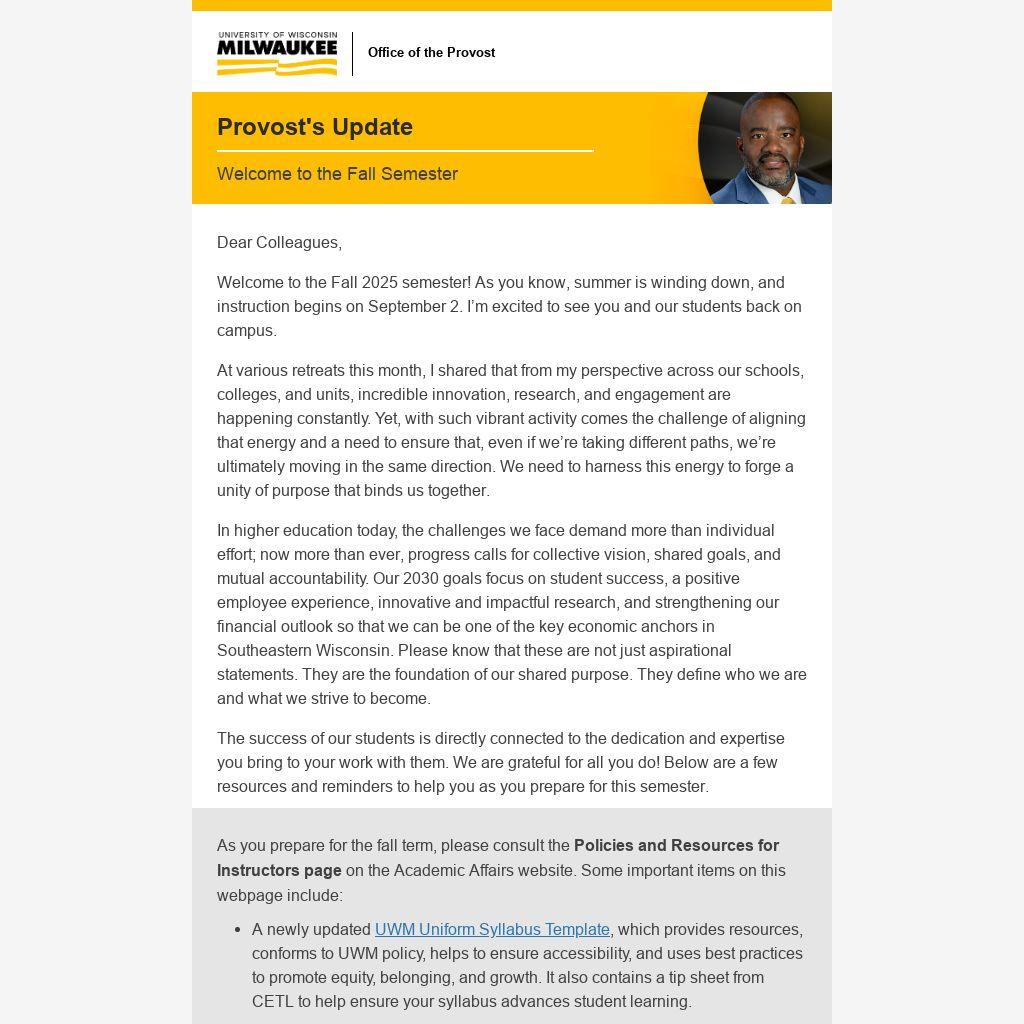 Welcome to the Fall 2025 semester! As you know, summer is winding down, and instruction begins on September 2. I’m excited to see you and our students back on campus.