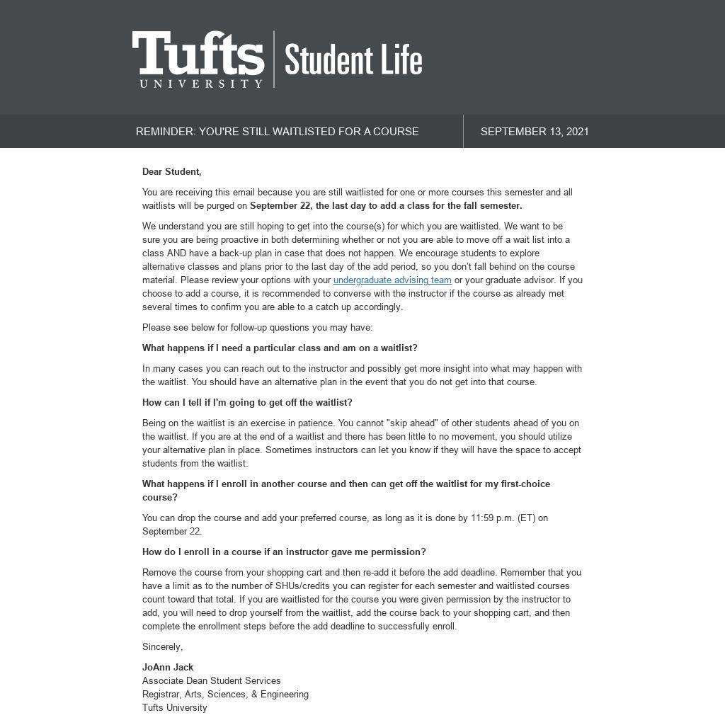 You are receiving this email because you are still waitlisted for one or more courses this semester and all waitlists will be purged on September 22, the last day to add a class for the fall semester.