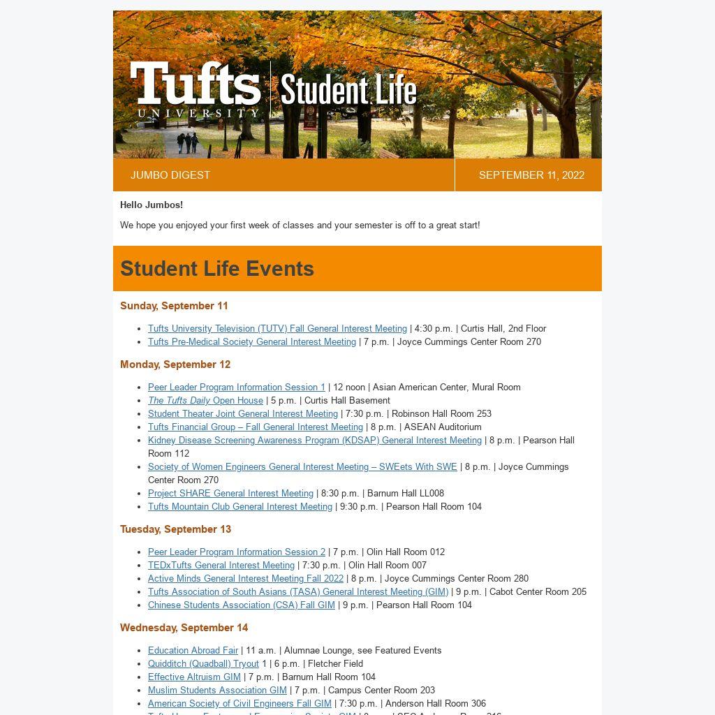 Students and Student Organizations can submit events to JumboLife by Thursdays at 12 noon and we'll include them in the Jumbo Digest!