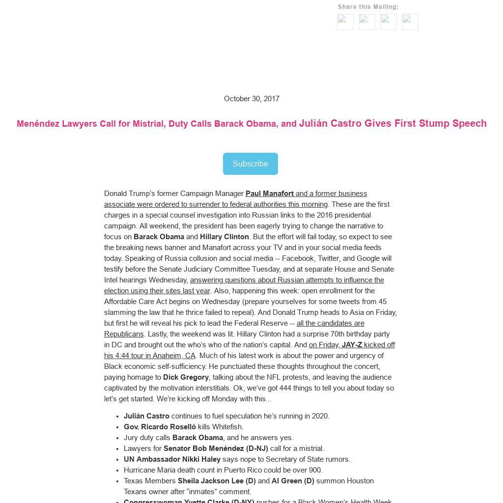 Donald Trump’s former Campaign Manager Paul Manafort and a former business associate were ordered to surrender to federal authorities this morning. These are the first charges in a special counsel investigation into Russian links to the 2016 presidential campaign. All weekend, the president has been eagerly trying to change the narrative to focus on Barack Obama and Hillary Clinton. But the effort will fail today, so expect to see the breaking news banner and Manafort across your TV and in your social media feeds today. Speaking of Russia collusion and social media -- Facebook, Twitter, and Google will testify before the Senate Judiciary Committee Tuesday, and at separate House and Senate Intel hearings Wednesday, answering questions about Russian attempts to influence the election using their sites last year. Also, happening this week: open enrollment for the Affordable Care Act begins on Wednesday (prepare yourselves for some tweets from 45 slamming the law that he thrice failed to repeal). And Donald Trump heads to Asia on Friday, but first he will reveal his pick to lead the Federal Reserve -- all the candidates are Republicans. Lastly, the weekend was lit. Hillary Clinton had a surprise 70th birthday party in DC and brought out the who’s who of the nation’s capital. And on Friday, JAY-Z kicked off his 4:44 tour in Anaheim, CA. Much of his latest work is about the power and urgency of Black economic self-sufficiency. He punctuated these thoughts throughout the concert, paying homage to Dick Gregory, talking about the NFL protests, and leaving the audience captivated by the motivation interstitials. Ok, we’ve got 444 things to tell you about today so let’s get started. We’re kicking off Monday with this...