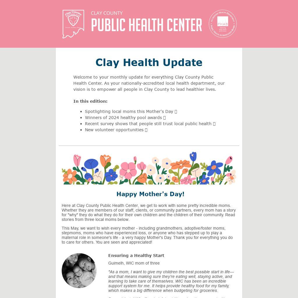 Welcome to your monthly update for everything Clay County Public Health Center. As your nationally-accredited local health department, our vision is to empower all people in Clay County to lead healthier lives.