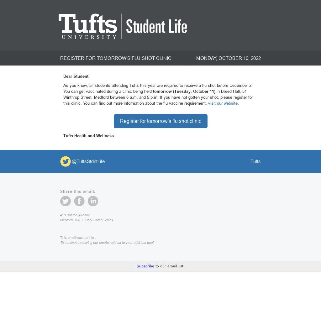 As you know, all students attending Tufts this year are required to receive a flu shot before December 2. You can get vaccinated during a clinic being held tomorrow (Tuesday, October 11) in Breed Hall, 51 Winthrop Street, Medford between 8 a.m. and 5 p.m. If you have not gotten your shot, please register for this clinic. You can find out more information about the flu vaccine requirement, visit our website.