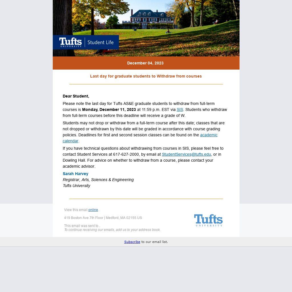 Please note the last day for Tufts AS&E graduate students to withdraw from full-term courses is Monday, December 11, 2023 at 11:59 p.m. EST via SIS. Students who withdraw from full-term courses before this deadline will receive a grade of W.