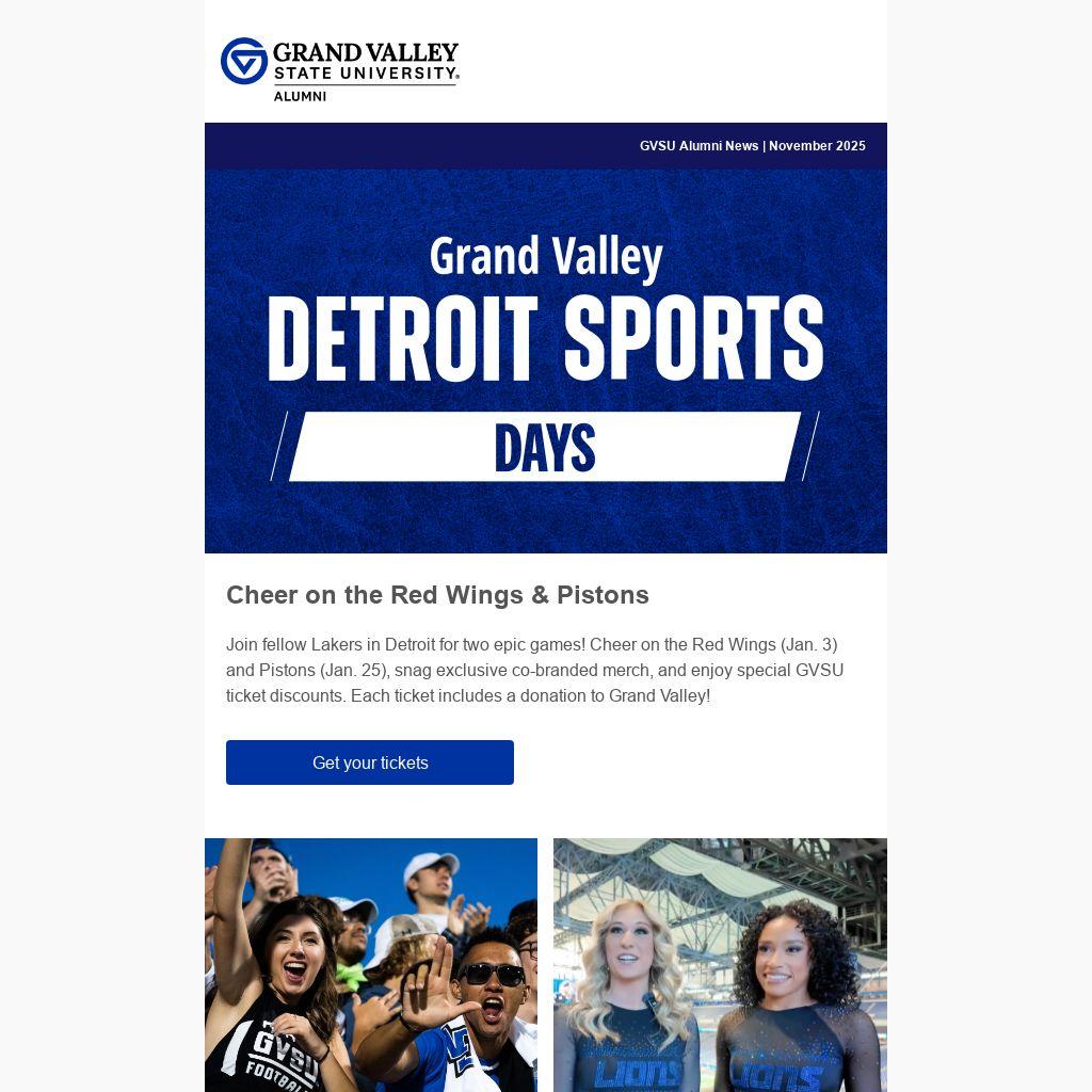 Join fellow Lakers in Detroit for two epic games! Cheer on the Red Wings (Jan. 3) and Pistons (Jan. 25), snag exclusive co-branded merch, and enjoy special GVSU ticket discounts. Each ticket includes a donation to Grand Valley!