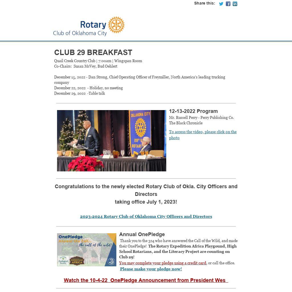Rotary Club 29 has an online membership directory which contains current content information for all club members. The link to access the Club 29 directory can be found at the top of the home page of okcrotary.club or by clicking here.