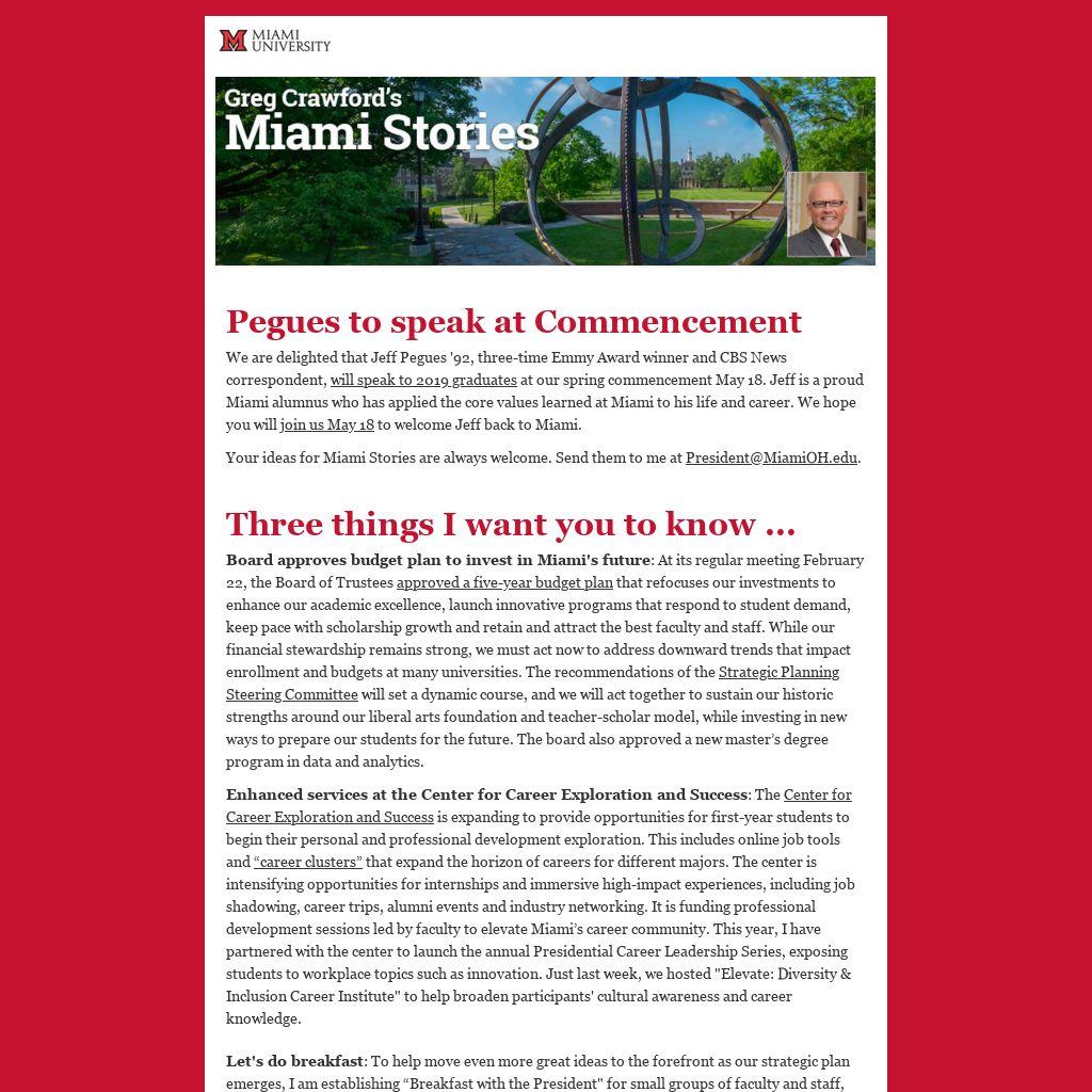 Let's do breakfast: To help move even more great ideas to the forefront as our strategic plan emerges, I am establishing “Breakfast with the President" for small groups of faculty and staff, starting this spring. We are working out the details and will share them soon. We will have an informal agenda around one or more themes to discuss Miami's strategic initiatives and to learn about new ideas, visions and aspirations. Thank you for participating and collaborating. I look forward to discussing our future together.