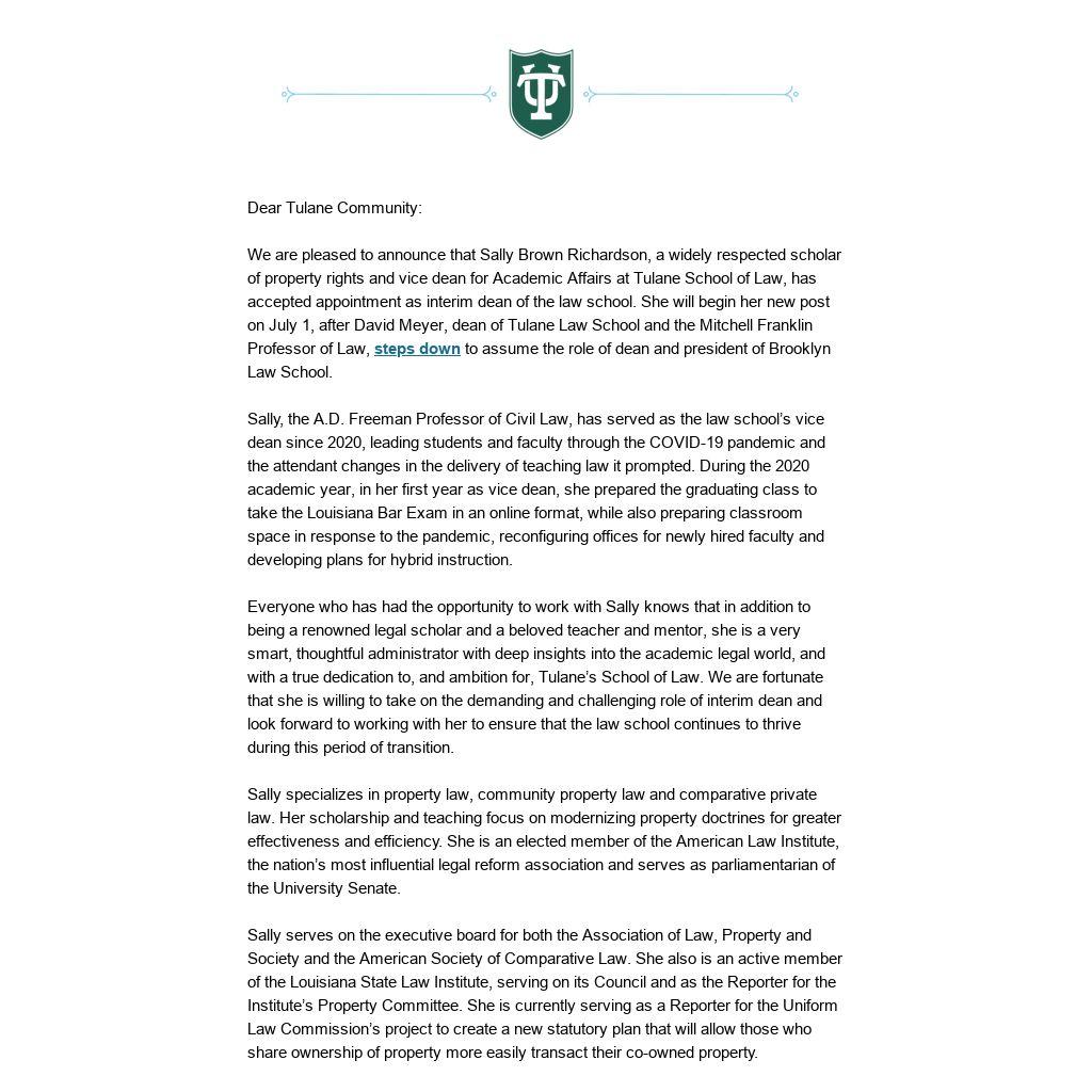 We are pleased to announce that Sally Brown Richardson, a widely respected scholar of property rights and vice dean for Academic Affairs at Tulane School of Law, has accepted appointment as interim dean of the law school. She will begin her new post on July 1, after David Meyer, dean of Tulane Law School and the Mitchell Franklin Professor of Law, steps down to assume the role of dean and president of Brooklyn Law School.