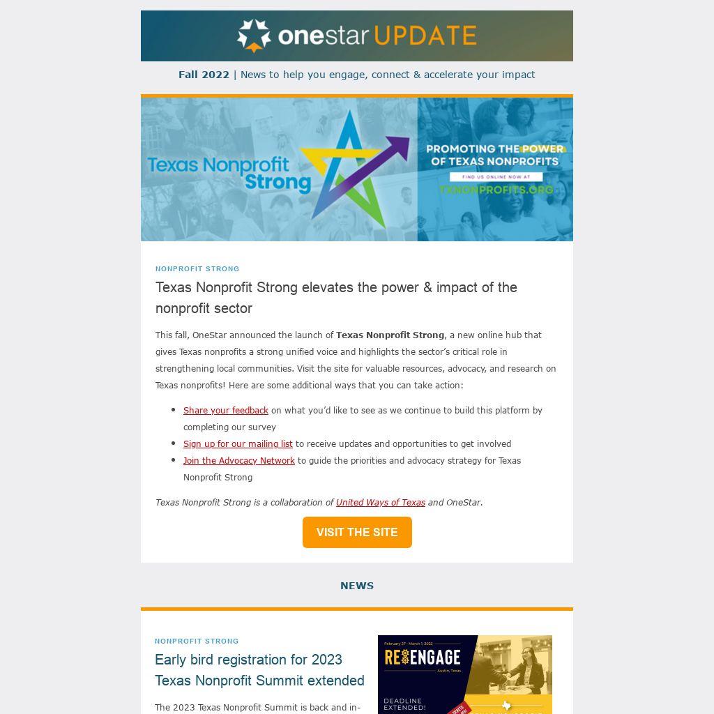 This fall, OneStar announced the launch of Texas Nonprofit Strong, a new online hub that gives Texas nonprofits a strong unified voice and highlights the sector’s critical role in strengthening local communities. Visit the site for valuable resources, advocacy, and research on Texas nonprofits! Here are some additional ways that you can take action: