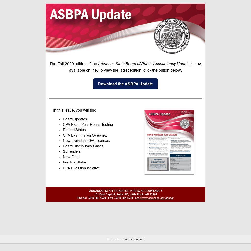 The Fall 2020 edition of the Arkansas State Board of Public Accountancy Update is now available online. To view the latest edition, click the button below.